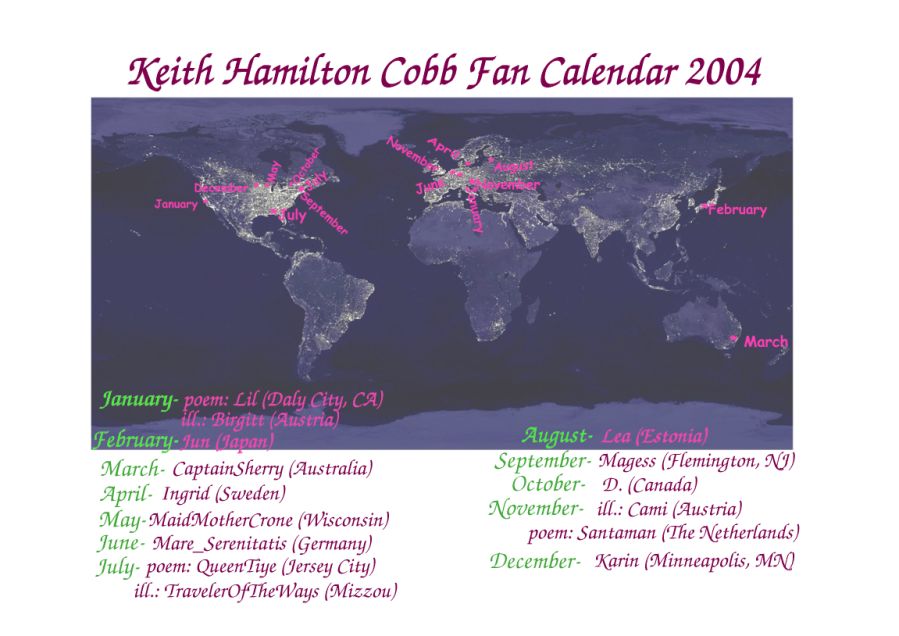 ![]() January- Roz February- Karin March- Philippa April- Cami&Santaman May- MaidMotherCrone June- Cait & Lea July- Birgitt August - Lea September - BikerX October - L.D.Neill November - mare_s December - Lil&Lea January- Lil & Birgitt February- Jun March- CaptainSherry April- Ingrid May- MaidMotherCrone June- mare_serenitatis July- QueenTiye & August - Lea September - Magess October - L.D.Neill November - Cami& December - Karin | Poem calendar is a traditionalpresentwhat fans have created to Keith Hamilton Cobb every year since 2002.All these calendars have been printed out and sent to Keith by post. We arecreating thecalendars in the Fans KeithHamilton Cobb Message Board.The calendar contains poems and pictures created to Keith Hamilton Cobbby fans throughout the world. We will start to make the next calendar in September.Everybody who wish to join will be welcome. The tradition of poem calendarwas born because of we wanted to make toKeith Hamilton Cobb a present which he can not buy from shop. The creation of calendar hasbeen wonderful joy and Keith Hamilton Cobb has beenexciting Muse. Thank you to everybodywho have participated! And special thanks to Diane for printing firstthree calendars and sending to Keith. Regards, Lea. |